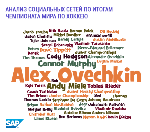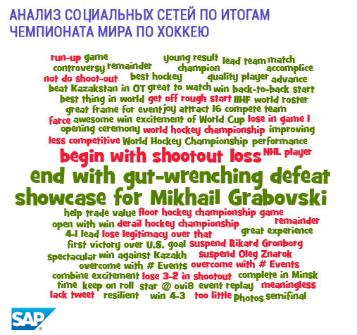 Компания SAP СНГ проанализировав 26 млн. просмотров интернет-сообщений на тему Чемпионата мира по хоккею 2014 в Минске, подвела итоги аналитического исследования социальных сетей. Героями ЧМ по мнению мировой интернет-аудитории в российской сборной по хоккею стал Александр Овечкин, а в сборной Беларуси - Михаил Грабовский.«Детальная картина отношения общества к такому масштабному мероприятию, как Чемпионат мира по хоккею с шайбой в Минске – лучшее доказательство эффективности современных инструментов бизнес-аналитики. С помощью решения SAP Social Media Analytics by NetBase, мы смогли в реальном времени оценить не только формальные критерии, но и эмоциональный фон. Решение позволяет пользователю распознать мельчайшие смысловые оттенки и точно определить тональность сообщений, тем самым глубже понять аудиторию и предложить ей те возможности, продукты и услуги, которые будут приняты максимально позитивно», - отметил Андрей Горяйнов, управляющий директор SAP в Республике Беларусь.