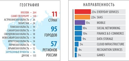 Третье место занимает направление решений и приложений для мобильных устройств (15%). Далее следуют проекты в сфере социальных медиа (10%), технологические решения в области финансов и электронной коммерции (10%) и сервисы обработки и хранения данных (9%).Инвестиции