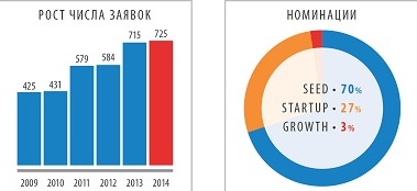 188 проектов из 725 являются резидентами или выпускниками бизнес-инкубаторов/акселераторов. Больше всего конкурсантов представляют ФРИИ, Бизнес-инкубатор «Ингрия» (Санкт-Петербург), ИТ-Парк (площадки в Казани и Набережных Челнах), Фонд «Сколково» и Бизнес-инкубатор LIFT (Астрахань). Всего же участниками конкурса стали проекты почти 50 федеральных, региональных, частных и студенческих инкубаторов, причем не только российских. 68% всех проектов запущены в
