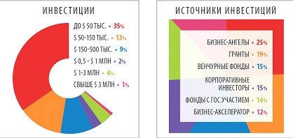 Около 70% участников развивают проект либо на собственные средства, либо на средства, полученные от родственников и друзей (до $ 50 тысяч). В то же время более 200 проектов уже привлекали финансирование, из них 25% — бизнес-ангельские инвестиции, 19% — российские и зарубежные гранты. 26% приходится на финансирование, полученное от бизнес-акселераторов, институтов развития и фондов с государственным участием, по 15% — на венчурные фонды и корпоративных инвесторов.