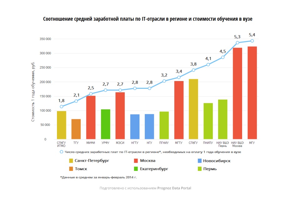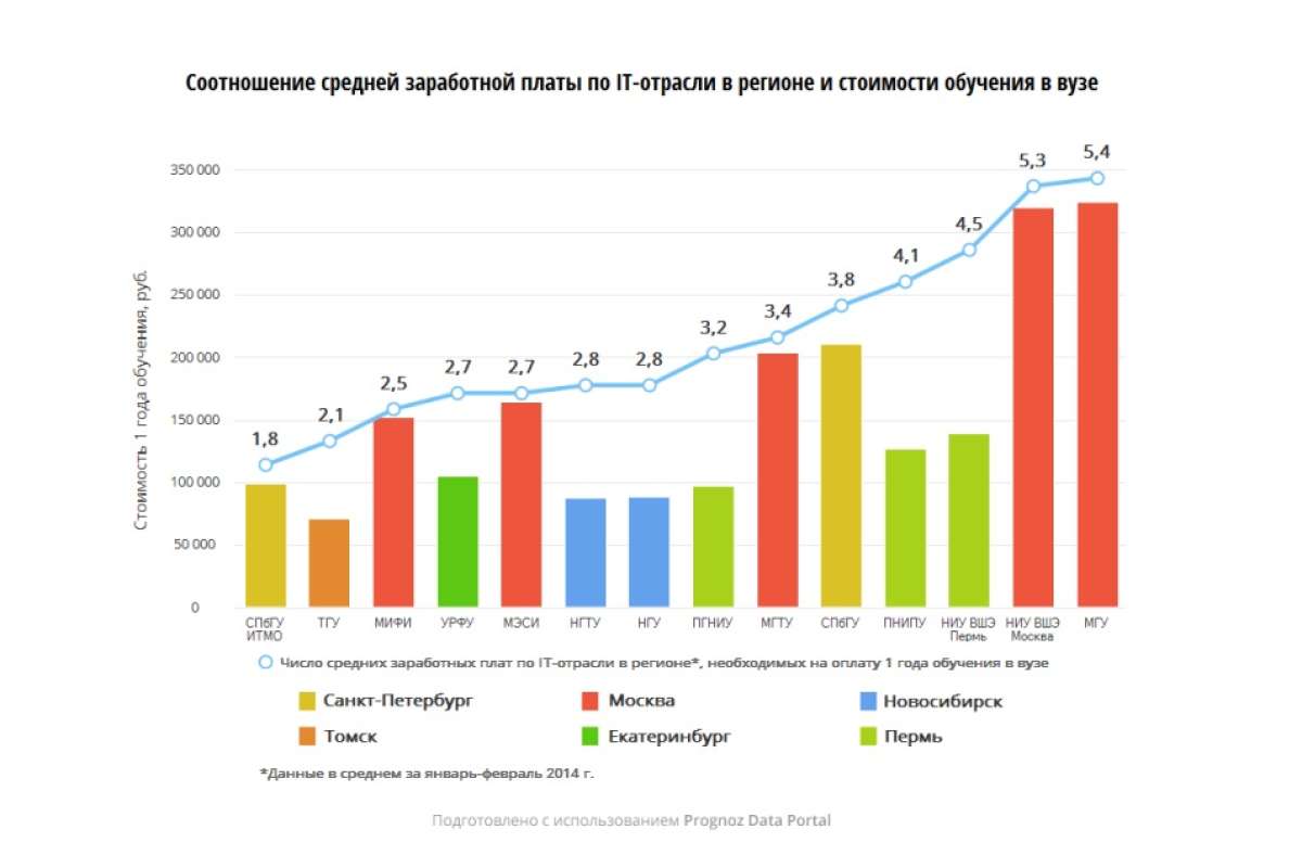 Компания «Прогноз», пользуясь собственным ресурсом Prognoz Data Portal, сопоставила данные о ценах обучения бакалавров и специалистов по IT-специальностям из различных источников.