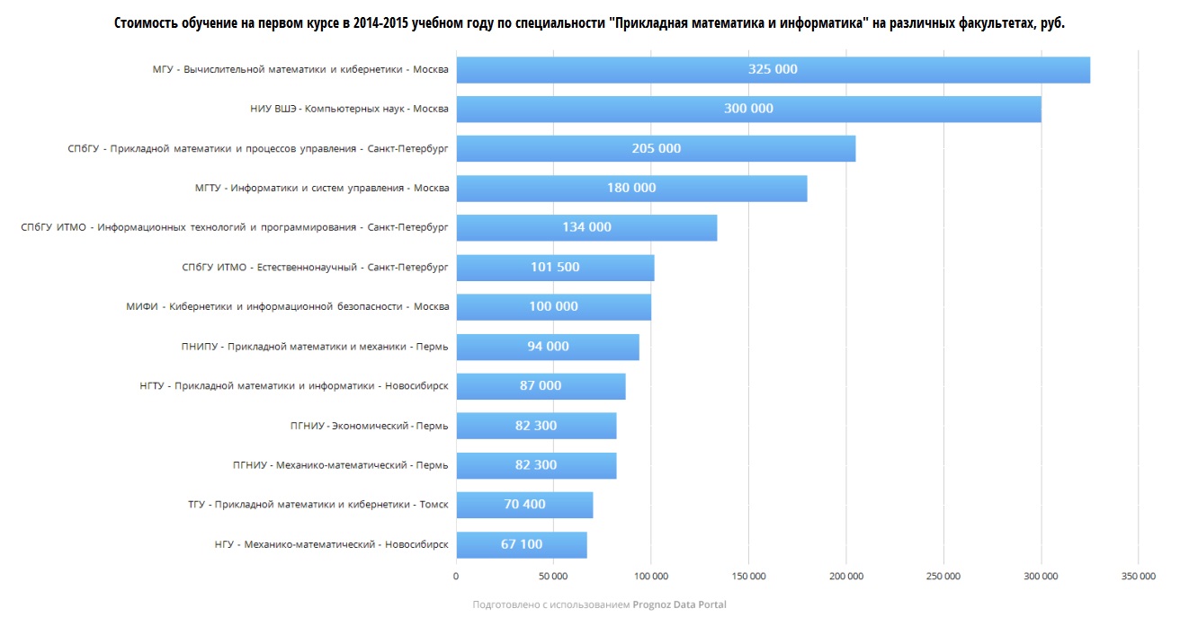 Если говорить об одной из самых популярных специальностей — «Прикладная математика и информатика», то самые высокие цены за год обучения предлагают московские вузы МГУ и ВШЭ. Цены на обучение в региональных вузах сопоставимы между собой и в среднем в
