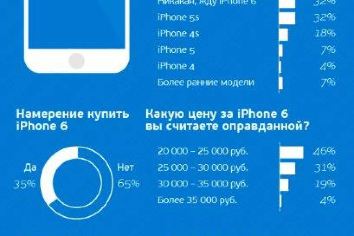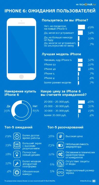 «По собственной информации и данным ритейлеров, официальная цена 4,7-дюймового iPhone 6 в России составит 29 990 рублей за начальную конфигурацию, а цена 5,5-дюймовой модели составит 34 990 рублей. Самая дорогая версия 5,5-дюймиовой модели со 128 Гб памяти ожидается по цене от 45 до 50 тысяч рублей, — комментирует Антон Спиридонов, главный редактор Hi-Tech Mail.Ru. — Кроме того, ритейлеры отмечают, что iPhone 6 будет намного популярнее предшественника, так как в новой модели критичное число давно ожидаемых изменений, и, в первую очередь, больший экран».