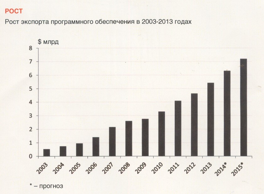 Обо всем этом говорилось, в том числе, представителям государственных структур и родственных ИТ-объединений на юбилейном собрании РУССОФТ, состоявшемся 9 сентября в Москве. В свою очередь Валентин Макаров отметил, что именно экспортное направление российского софтверного рынка на протяжении всей своей истории является самым динамичным направлением в отечественной ИТ-отрасли: за последние 10 лет объем экспорта российского ПО (услуги заказной разработки и программные продукты) вырос в десять раз — с 500 млн. долл. в 2003 году до 5,6 млрд. долл. в 2013 году, заметно опережая средние темпы роста внутреннего ИТ-рынка. Устойчивость и перспективность экспортно-ориентированной разработки была хорошо видна во время мирового экономического кризиса