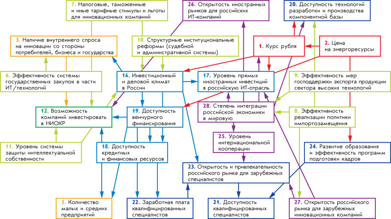 Кроме экономических причин некоторые эксперты называют технологические — отсутствие радикальных новшеств, которые могут заставить конечного пользователя сменить старого «коня» на нового. Разумеется, на продажи ПК в России влияют не только технологические — специфические для данного сегмента факторы, но также политические и макроэкономические. Авторы недавно опубликованного 80-страничного отчета ОАО «РВК» и консалтинговой компании Ernst & Young «Сценарии инновационного развития и глобализации российской отрасли информационных технологий» перечисляют 28 факторов такого рода. При этом они разбивают их на восемь категорий («Макроэкономика», «Рынок», «Государство», «Компании», «Научное сообщество», «Денежные средства», «Люди и ресурсы», «Экспорт/импорт») и отмечают взаимосвязи между этими факторами (см. рис.).