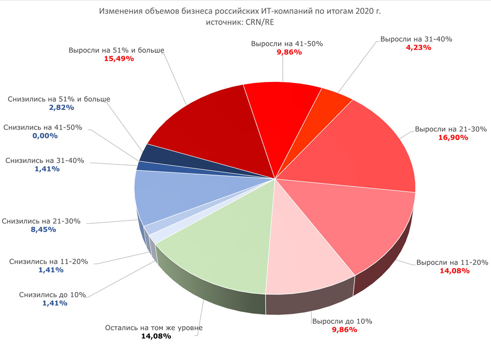 Опрос проводился в марте-апреле 2021 г. на сайте www.novostiitkanala.ru. В нем приняли участие представители 213 ИТ-компаний. И судя по их ответам, на российском ИТ-рынке все не так уж и плохо. Компании, чей бизнес в 2020 г. увеличился по сравнению с 2019 г. оказались в большинстве. Их доля в ответах респондентов превысила 70% (розово-красный сегмент диаграммы). Около 14% ответивших, сообщили, что в 2020 г. показатели бизнеса остались на том же уровне, что и в предыдущем. Таким образом те, чьи продажи в прошлом году сократились, составили всего 15,5%.