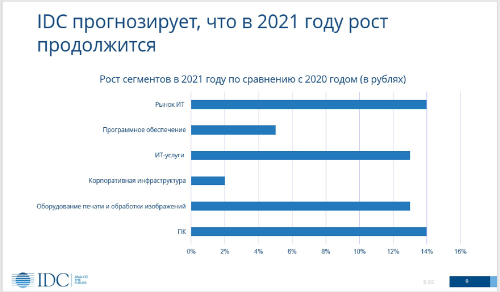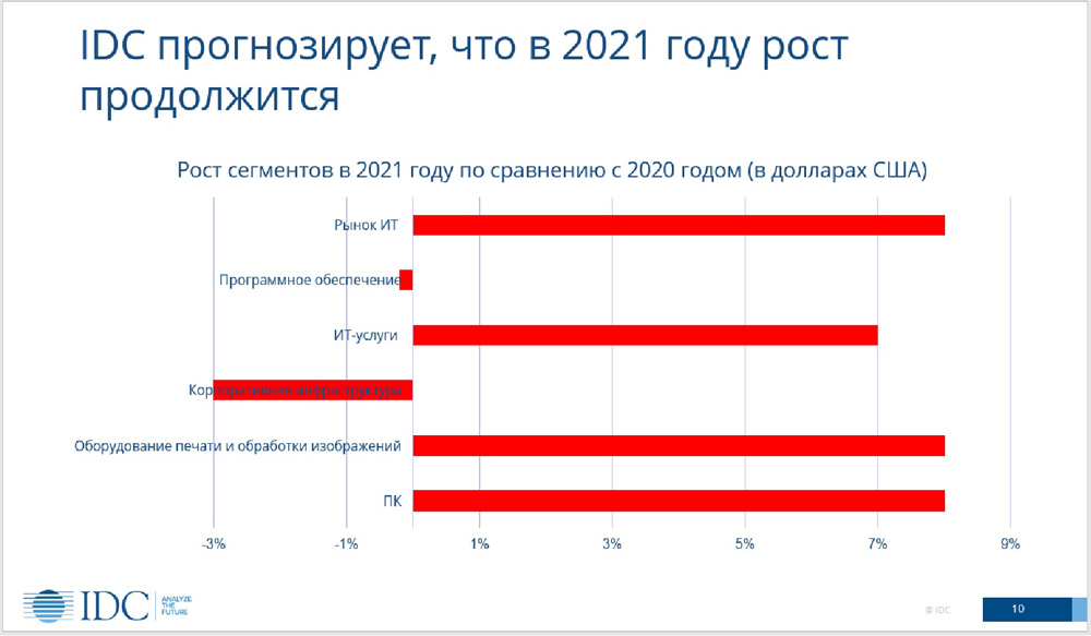 Тем не менее, IDC предложила свое видение текущего года. По словам Роберта Фариша, нынешний прогноз кажется отголоском презентаций, которые он делал в 2008 и 2014 гг.: «Прогнозировать что-то сейчас очень сложно, тем не менее, мы видим, что первый квартал 2021 г. был достаточно хорошим для большинства сегментов ИТ-рынка. Перспективы второго квартала также выглядят достаточно неплохо с точки зрения как массового рынка, так и рынка проектов. И мы не видим никаких очевидных причин и заметного ухудшения условий во второй половине года».