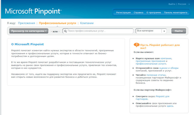 Попасть на эту площадку может только партнер Microsoft. Причем любой, даже не обладающий статусами, а просто зарегистрировавшийся как участник программы на ежегодной основе. Так что на сайте Pinpoint все партнеры равны, и только от них самих зависит, как они будут здесь представлены.