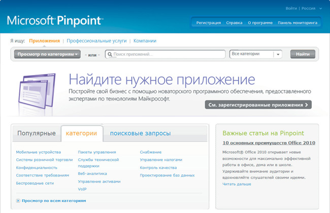 Информацию о реализованных проектах или свои предложения для клиентов партнер размещает сам (скоро это можно будет сделать непосредственно на сайте Pinpoint). Пока же решения переносятся с уходящего «в отставку» сайта Solution Finder, где ранее партнеры Microsoft размещали свои проекты.