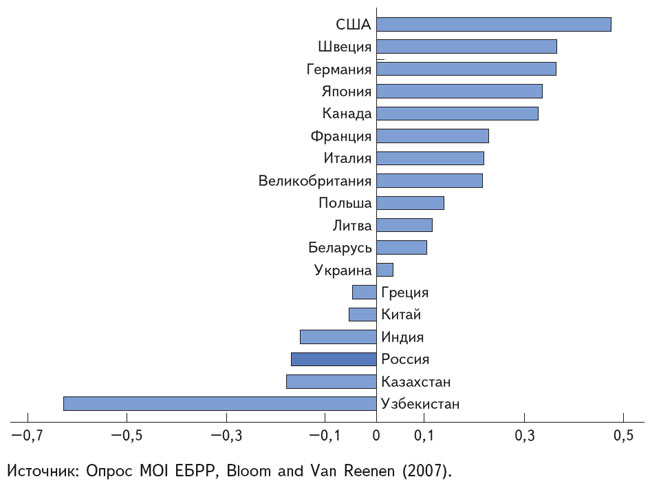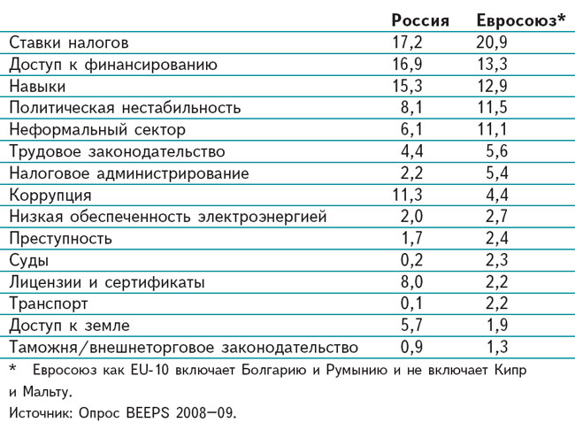 России все еще предстоит решать серьезные задачи повышения эффективности работы предприятий, создавать на рынках действенную конкуренцию и осуществить переход к передовым практикам корпоративного управления и коммерческой деятельности. По эффективности менеджмента, как полагают эксперты ЕБРР, Россия отстает не только от западных стран, но и от Китая, Индии и ряда своих же соседей по СНГ (см. рис. 2). Наряду с налогами, недостаточными инвестициями и коррупцией низкий уровень профессионализма как руководителей, так и сотрудников предприятий в опросе ЕБРР назван одним из ключевых препятствий к ведению бизнеса в России (см. табл.).