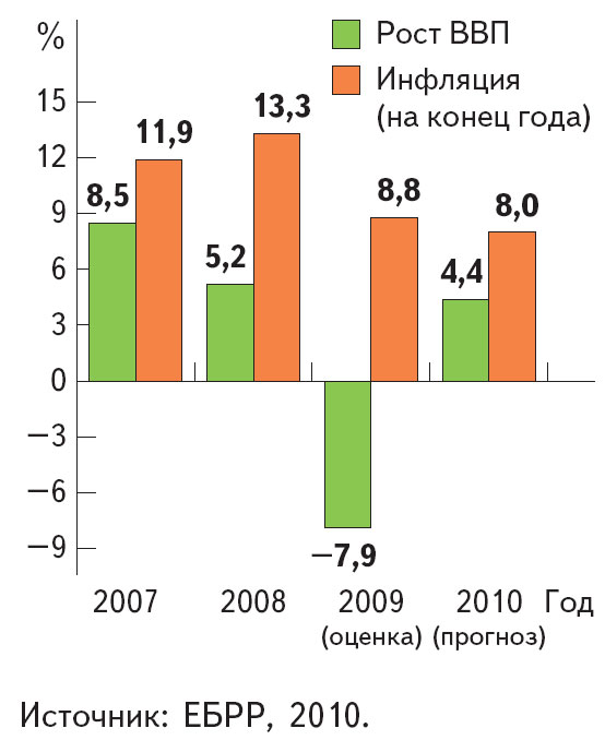 Умеренные темпы роста, зафиксированные в России в первой половине 2010 г., как полагают эксперты ЕБРР, вероятно, сохранятся и в будущем, так что можно ожидать, что по итогам 2010 г. они составят около 4,4%, а в 2011 г. несколько увеличатся. Ключевым фактором риска по-прежнему остаются цены на нефть и другие сырьевые товары. Руководители столкнутся с задачей достижения в среднесрочной перспективе бюджетной консолидации на фоне все еще неустойчивого оживления экономики. Это особенно важно с учетом того, что истощение бюджетного резервного фонда (объем которого сократился с 225 млрд. долл. США в начале 2009 г. до примерно 125 млрд. долл. США к середине 2010 г.) может привести к повышению уязвимости экономики от колебаний цен на сырьевые товары.