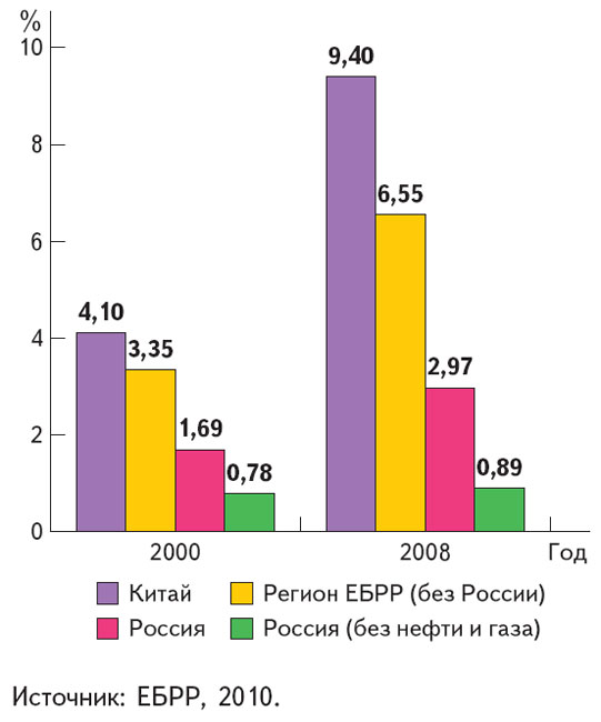 Рост экспорта, хотя и сопровождающийся еще более стремительным ростом импорта, в прошлом действительно показывал неплохие результаты в регионе с переходной экономикой: в период с 2000-го по 2008 г. доля экспорта этого региона в общемировом экспорте выросла вдвое — с 5% до почти 10% (см. рис. 4). Однако если мы рассмотрим Россию отдельно, то никакого роста несырьевого экспорта за эти годы не произошло. Отмечен в докладе и факт быстрого накопления российскими компаниями внешнего долга на фоне успехов сырьевого экспорта.