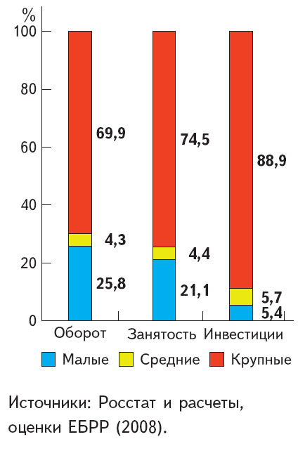 ругая — крайне незначительная роль в российской экономике средних предприятий (на момент исследования — с числом работников от 100 до 249 человек и годовым оборотом до 1 млрд. руб.). По мнению Эрика Берглофа, такое положение средних предприятий (см. рис. 3) обуславливает слабую конкуренцию, отставание в качестве менеджмента и низкие показатели экспорта несырьевых товаров. Именно средние предприятия в наибольшей степени страдают от препятствий и в наибольшей степени выигрывают от совершенствования бизнес-климата и навыков сотрудников.