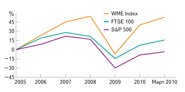 Этичное поведение на рынке способствует более успешному развитию компаний, подчеркивает Ethisphere Institute. Как видно из графика, в последние годы наиболее этичные компании (WME, желтая кривая) в среднем значительно опережают по динамике развития компании, учитываемые в индексах Standard & Poor’s 500 и FTSE 100 (синяя и зеленая кривые соответственно). В частности, отмечается, что финансовые компании, которые были наименее этичны и занимали низкую позицию или вообще не вошли в этот список, во время кризиса в большей степени столкнулись с проблемами, чем другие.