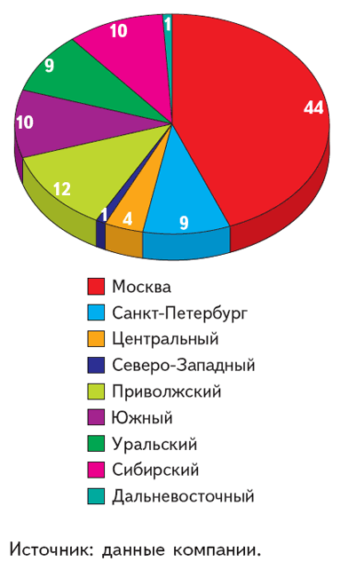 В последнее время в обороте компании увеличивается доля регионов. Если в 2009 г. на Москву приходилось 56% продаж, а на регионы — 44%, то по итогам I полугодия этого года картина изменилась на противоположную. Максимальный прирост (217%) в I полугодии 2011 г. по сравнению с тем же периодом прошлого года наблюдался на Дальнем Востоке, хотя этот регион и занимает лишь 1% в структуре продаж дистрибьютора.