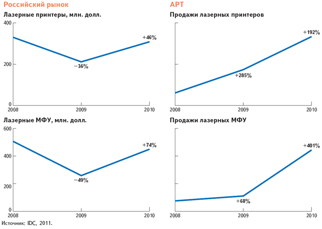 Как утверждает Елена Жуплатова, бизнес APT Distribution стремительно рос и во время кризиса. Ссылаясь на данные IDC, она сообщила, что в 2009 г., когда российский рынок лазерных принтеров упал на 36%, продажи дистрибьютора выросли на 285% по сравнению с 2008 г. В сегменте лазерных МФУ, где спад составил 49%, продажи APT Distribution увеличились на 68%. Впечатляющих результатов компании удалось добиться и в прошлом году: продажи лазерных принтеров выросли на 192%, а лазерных МФУ — на 401% по сравнению с 2009 г. По словам Елены Жуплатовой, в 2010 г. МФУ Kyocera Mita было продано в 6,4 раза больше, чем в докризисном 2008-м. А в I полугодии 2011 г. они увеличились в 3,14 раза по сравнению с тем же периодом прошлого года.