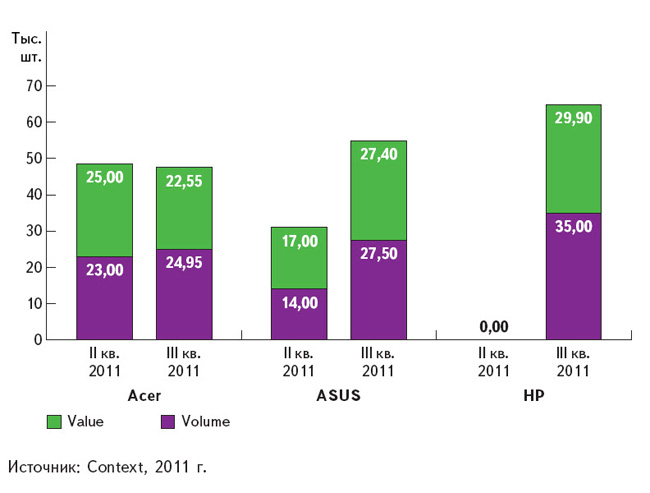 Специфика России такова, что на нашем рынке преимущество Apple не такое подавляющее, как в других странах. Кроме того, в течение первых трех кварталов 2011 г. мы отмечали интенсивный рост числа игроков, то есть увеличивалось количество торговых марок, под которыми поставляются планшеты. Например, в I квартале 2011 г. российский рынок делили между собой десяток производителей, а во II квартале 2011 г. „навскидку“ можно было назвать уже 15 брендов. Этот тренд наблюдался и в III квартале 2011 г. Но это вполне естественно для „стартующего“ сегмента. Рынки, находящиеся в этой фазе, характеризуются активными действиями игроков, пытающихся войти в бизнес, так как через некоторое время их шансы станут равны нулю. Поэтому на зарождающихся рынках всегда присутствует большое количество игроков. И как следствие, по итогам III квартала 2011 г. Apple уступила лидерство в официальном канале продаж. Но справедливости ради стоит сказать, что если к этим цифрам прибавить „серые“ поставки, то победа все еще за Apple. Пятерка лидеров в данном сегменте российского ИТ-рынка выглядит так: Acer, Apple, ASUS, Samsung (перечислены в алфавитном порядке).