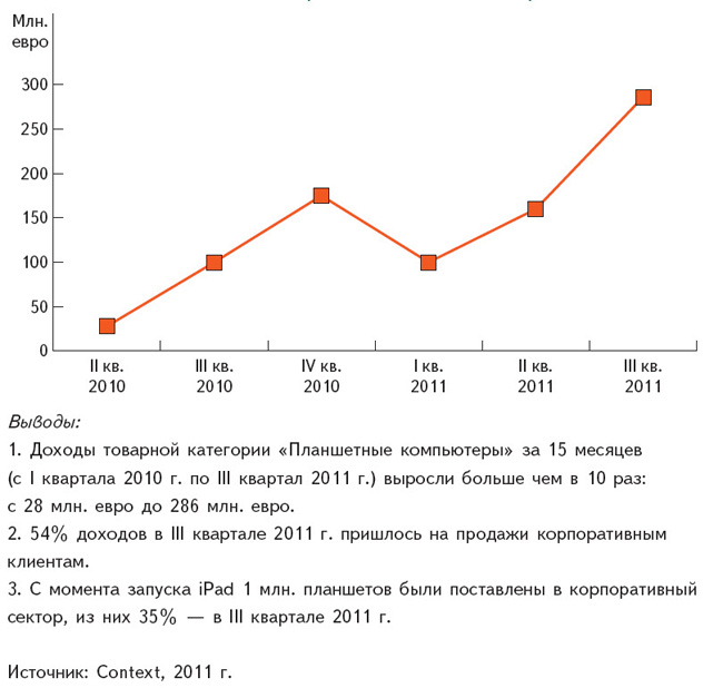 Замечу, что изначально iPad разрабатывали для частных пользователей. Но уже к III кварталу 2011 г. более 50% этих устройств приобрели корпоративные клиенты. В Европе планшеты стали рассматривать как идеальное устройство, дополнение к ноутбуку для тех, кто много путешествует и кому необходим постоянный доступ к рабочим документам. И это при том, что планшет сам по себе не может генерировать контент. Зато он помогает его презентовать.