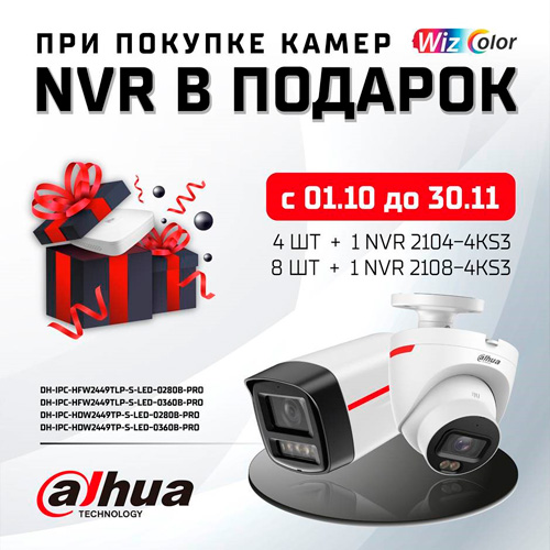 - При покупке восьми IP-видеокамер, вам будет отгружено бесплатно (на ваш выбор): один видеорегистратор DHI-NVR2108 или два видеорегистратора DHI-NVR2104.