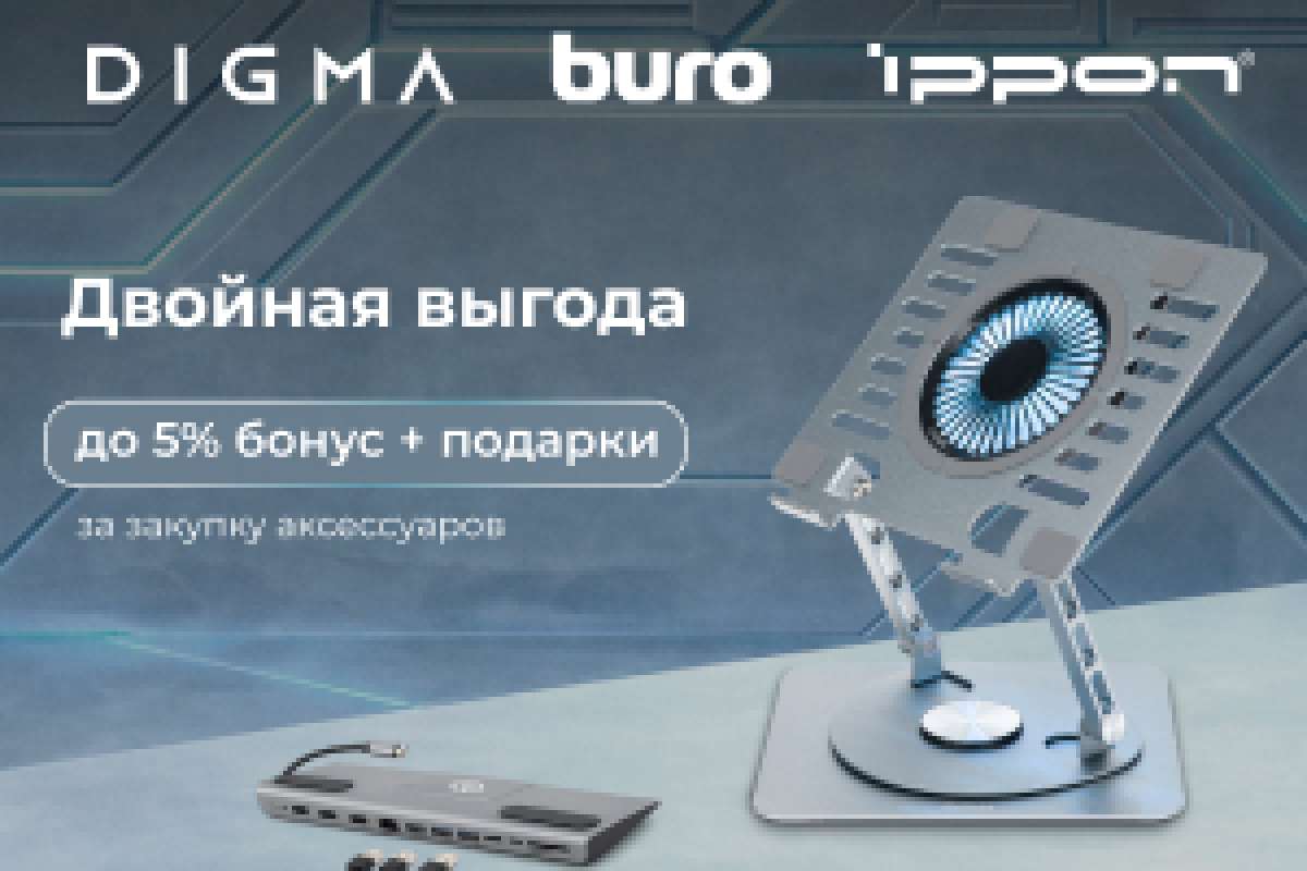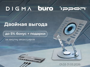 Вас ждет бонус до 5% за закупку аксессуаров брендов BURO, DIGMA, KingPrice, Ippon на сумму от 50 000 руб. За выполнение таргета – еще и дополнительный подарок!