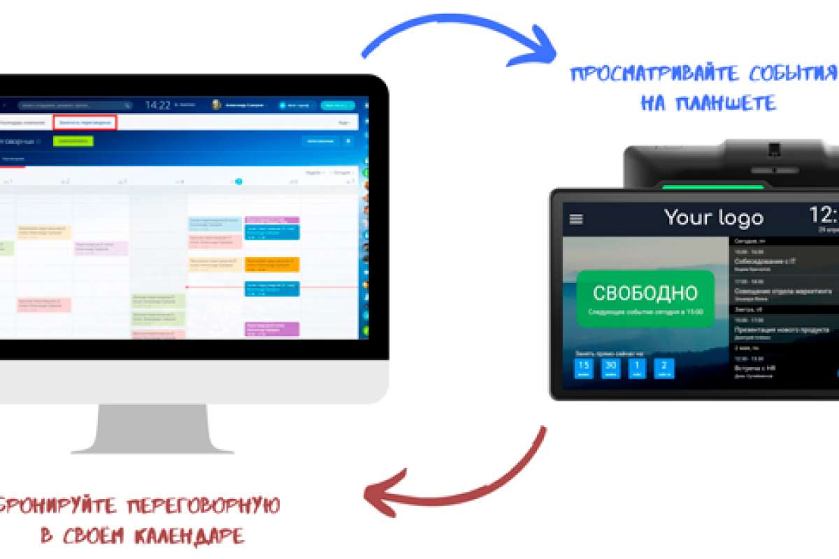 Сотрудники могут бронировать переговорную комнату с рабочего места или с планшета, установленного непосредственно у комнаты. На экране планшета выводится занято/свободно и ближайшие запланированные события. Крепление планшета обеспечивает надёжную установку даже на стеклянных поверхностях, не оставляя царапин и повреждений.