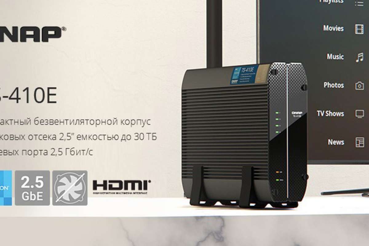 Компания QNAP выпустила четырехдисковый сетевой накопитель профессионального уровня TS-410E с безвентиляторным охлаждением корпуса, предназначенный для мультимедийных центров и мест установки, чувствительных к шуму и размерам NAS. Благодаря двум портам 2,5 Гбит/c, слотам для твердотельных накопителей SATA, портам USB 3.2 Gen 2 (10 Гбит/с) и видеовыходу 4K HDMI модель TS-410E универсальна для выполнения различных требовательных приложений, таких как обработка больших файлов, потоковая передача мультимедиа, видеонаблюдение и виртуальные машины.