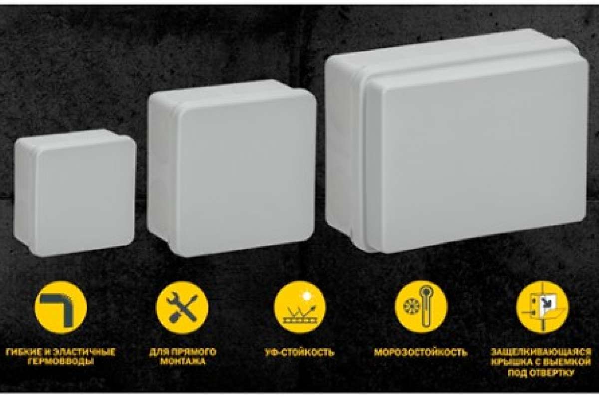 Двухкомпонентные монтажные коробки отличаются морозостойкостью и стойкостью к УФ-излучению, что подтверждено испытаниями в лаборатории. Уплотнитель по всему периметру основания и в местах крепления коробки обеспечивает защиту от пыли и влаги IP67.